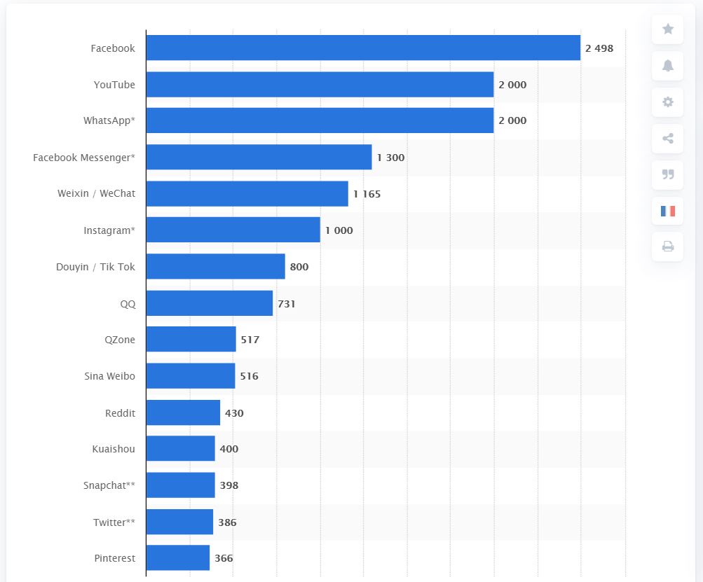 통계 자료를 보면 간단히 알 수 있다. 실제로 활동하는 사람이 많은 플랫폼이 효율적이다. 위 자료는 2020년 4월 한 달간 SNS 플랫폼에서 실제 활동한 사람 수를 나타낸다. 광고는 노출이 생명이기에 가입자가 몇 명인지 보다는, 그 가입자의 실제 활동 여부가 중요하다.