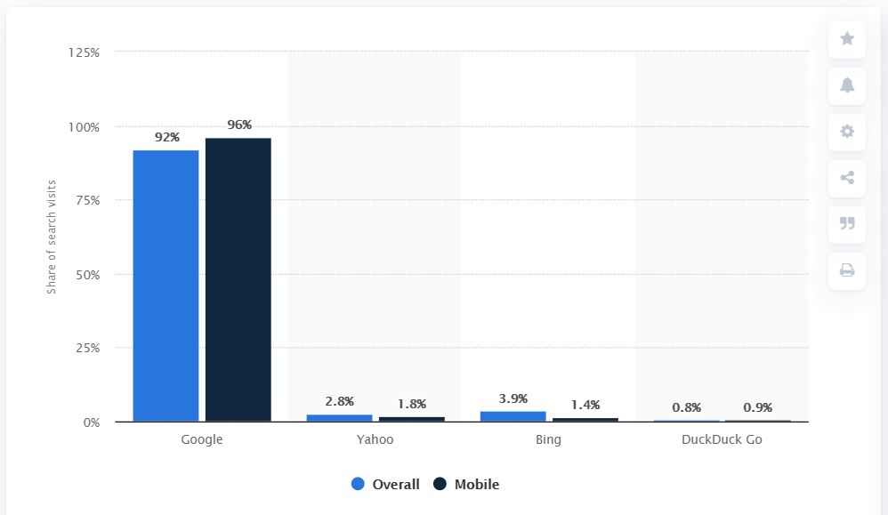 위 자료는 2020년 1분기에 미국 사람들이 사용한 검색 엔진 비율이다. 모바일(폰,태블릿)로 검색 시 미국인의 96%, 모든 기기 포함할 시 미국인의 92%가 구글을 사용한다. 통계를 보면 보인다, 구글에 그렇게 광고 노출을 하려는 이유이다.